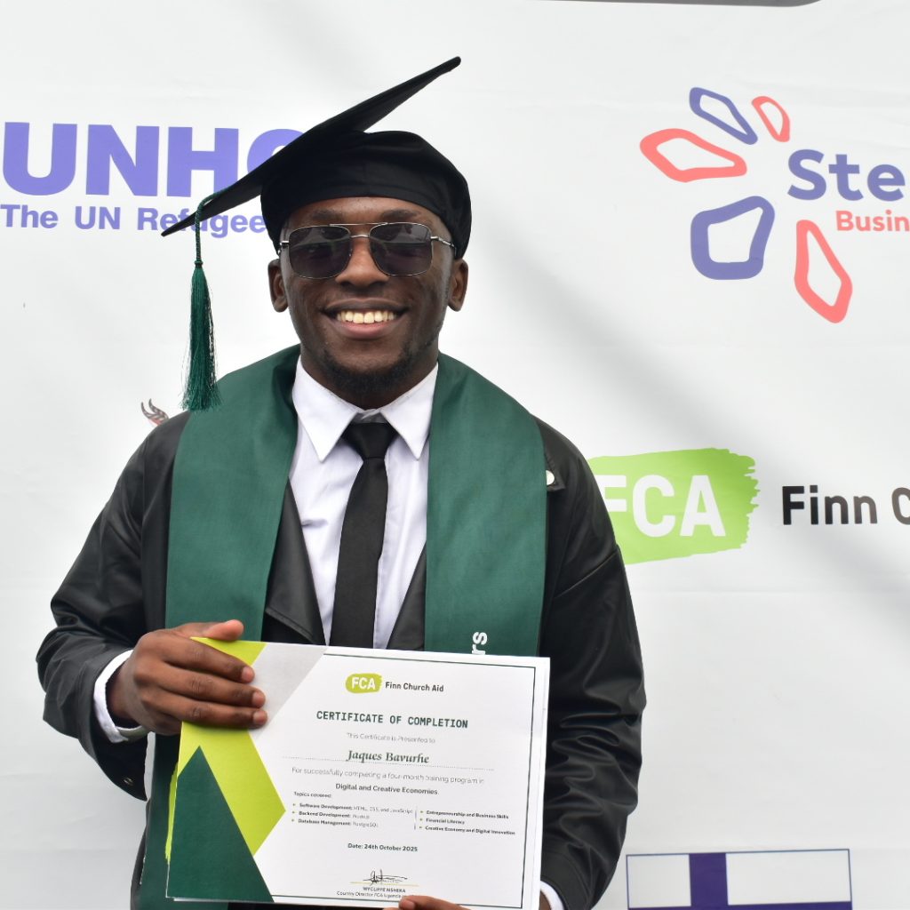 Kampala, Uganda – October 24, 2025: Finn Church Aid (FCA) Uganda has graduated more than 60 refugee and host community youth after completing four months of intensive training in Digital & Creative Economies, as well as Functional Carpentry & Woodwork.